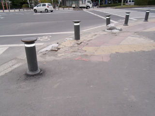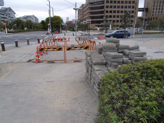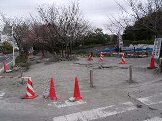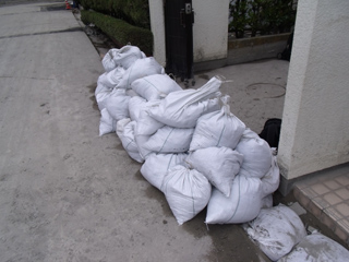 写真右手前の土嚢は、敷地と道路の間に大きく陥没した部分があり、そこの段差を解消するために置いたもの。